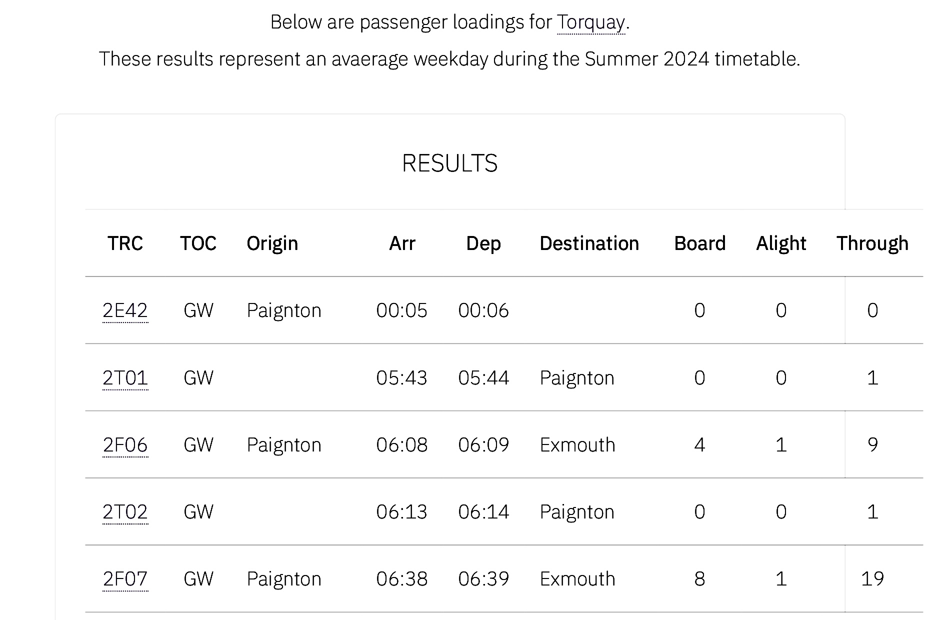 Source 1: https://www.railwaydata.co.uk/loadings/gbr/?TLC=PGN - covering an "average weekday during the summer of 2024" and show numbers of arrivals, departures and through passengers on each timetabled service. Change PGN to TQY and TRR to see the figures for Torquay and Torre to cover the the intermediate stations between Newton Abbott and Paignton. These come from a "no longer maintained" site, so I have member's mirror at