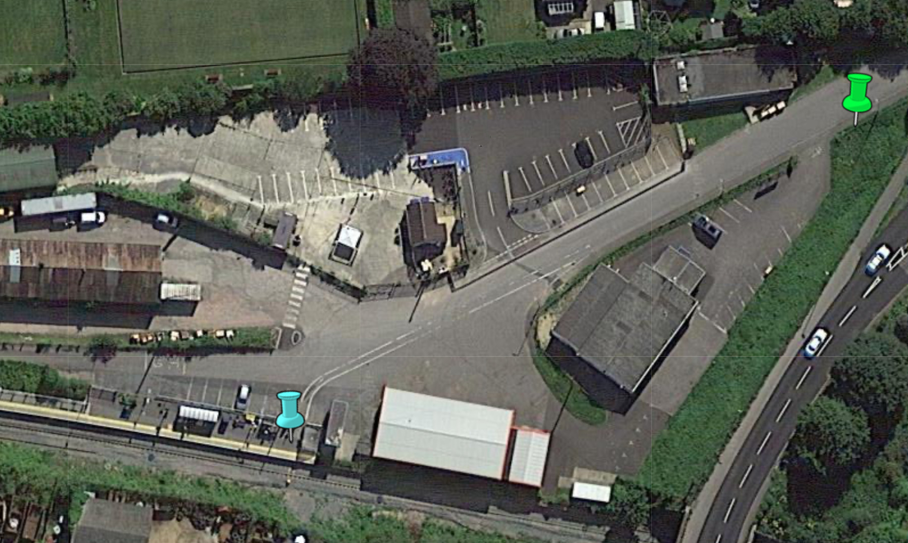 At present, the railway station is at the end of the little business estate called "Station Approach". Cars drive down these to seven businesses, 3 of which are car / vehicle based, two are other business that people drive in to work at, one is available for let but would be an ideal vehicle maintenance shop, and the final one is the TransWilts car park for the station and cafe. There is a pavement down one side of station approach, and a painted path for walkers and cyclists across the turning circle, which also serves as a waiting area for the tyre centre that's in a building on the southern end of the old (until 1966) platform. A further painted "zebra" crossing leads from the car park and cafe.
