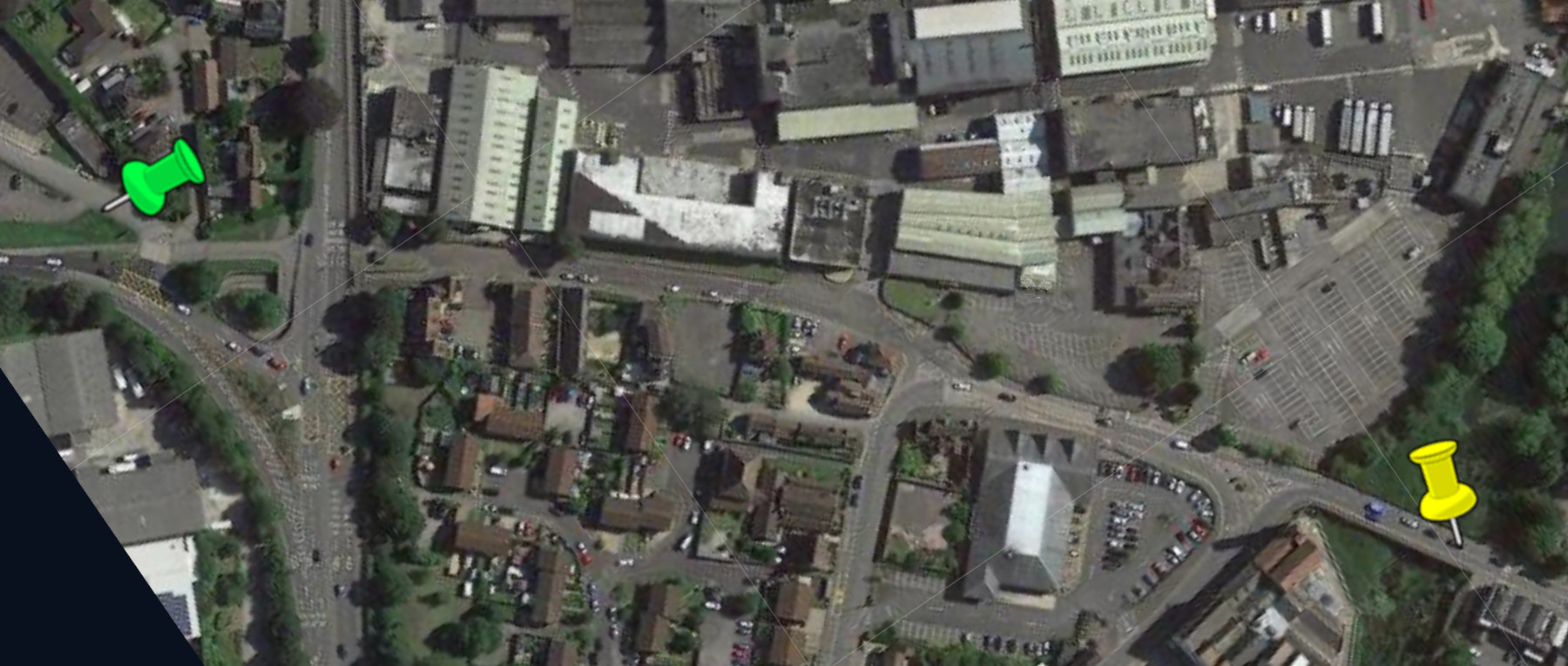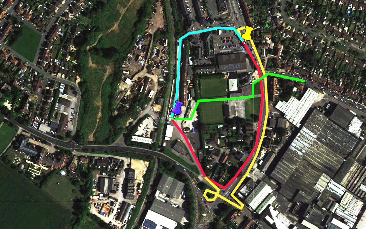 Arriving at the cyan push pin on foot, headed for the town centre (and most residences beyond) you walk up to the green push pin ...