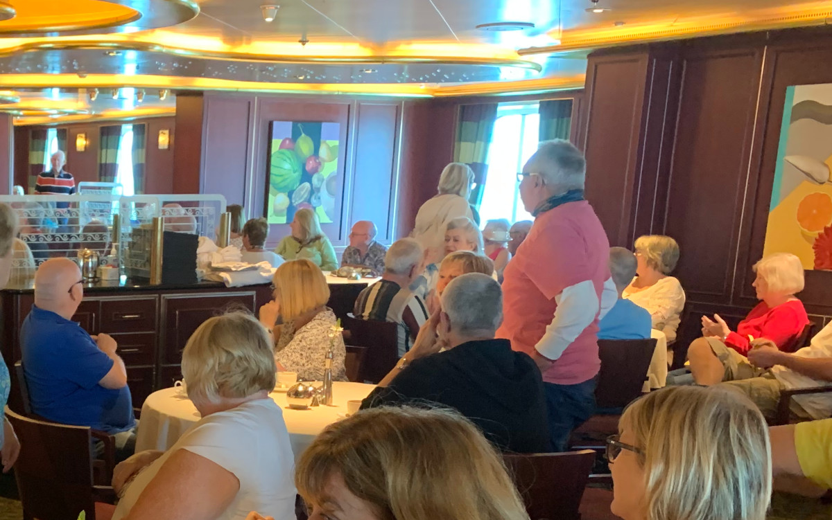 On Wednesday, we shared a table with three other couples. The lady in the Austrailian couple was a retired GP and spokesperson for the couple, telling of a strict Catholic school upbringing, of how cruises have to be booked via a Travel Agent and not direct in New South Wales, and of how they are going on after this cruise to stay with friends in Kent and East Anglia. The second couple declared themselves to be from Weston-super-mud and you can guess at the humour that followed, with a discussion as to whether a pair of binoculars was enough to see the sea, or a telecope is needed; we also ended up discussing quantum physics, big data, and the uses of The Tropicana. The third couple asked us where we were from, and when we said "Wiltshire" enquired more deeply and specifically, as they do too. And it turns out they live in Melksham too! A very interesting if unplanned discussion - they were talking of their use of the new Campus, and we talked of plastic animals too. As ever, conversation turned around the table to how and when people travelled to Southampton for the cruise, and (for the first time on this cruise) another couple had arrived there by train - starting with a local lift to Melksham Station.